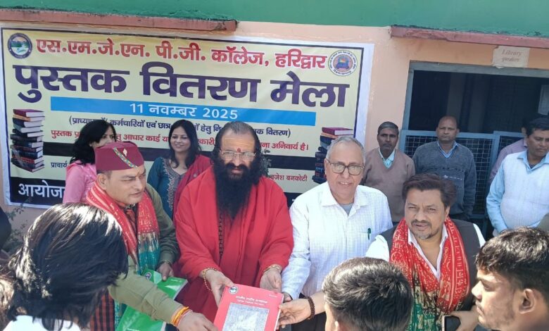 आज एस एम जे एन महाविद्यालय में उत्तराखंड मुक्त विश्वविद्यालय, हल्द्वानी द्वारा “निःशुल्क पुस्तक वितरण कार्यक्रम” के अंतर्गत विशाल पुस्तक मेले का आयोजन किया गया जिसमे सैकड़ों छात्र-छात्राओं एवं अध्यापकों को निःशुल्क पुस्तकें वितरित की गईं। इस अवसर पर कार्यक्रम की अध्यक्षता अखिल भारतीय अखाड़ा परिषद, माँ मनसा देवी मंदिर ट्रस्ट तथा कॉलेज प्रबन्ध समिति के अध्यक्ष श्री महंत रविन्द्रपुरी जी महाराज द्वारा की गयी। इस अवसर पर श्रीमहंत रविन्द्रपुरी ने कहा कि पुस्तके अंतर्मन को उज्जवल बनाती हैं इसी कारण वो रत्नों से भी मूल्यवान होती हैं। पुस्तकों के बिना परिपूर्ण ज्ञान की कल्पना भी नहीं की जा सकती। इस अवसर पर उत्तराखंड मुक्त विश्वविद्यालय के सहायक क्ष्रेत्रीय निदेशक एवं समन्वयक डॉ बृजेश बनकोटी ने कहा कि उत्तराखंड मुक्त विश्वविद्यालय जन जन तक शिक्षा पहुंचाने को कटिबद्ध हैं। डॉ. बृजेश बनकोटी ने कहा कि मुक्त विश्वविद्यालय विद्यार्थियों की आवश्यकताओं को ध्यान में रखते हुए निःशुल्क पुस्तक वितरण कार्यक्रमों का आयोजन कर रहा है। उन्होंने विद्यार्थियों को पुस्तकों के महत्व के बारे में बताते हुए कहा कि पुस्तकों का व्यक्ति के ज्ञान बढ़ाने में महत्वपूर्ण योगदान है। इस योजना का लाभ सभी से उठाने की अपील की।उन्होंने कहा कि रुड़की क्षेत्रीय केंद्र के अंदर 7 मेलो का आयोजन किया जा रहा है। इस अवसर पर महाविद्यालय के प्राचार्य प्रो सुनील कुमार बत्रा ने उत्तराखंड मुक्त विश्वविद्यालय द्वारा निशुल्क पुस्तक वितरण के इस कार्यक्रम की प्रशंसा करते हुए कहा कि छात्रों को पुस्तकों द्वारा एक बेहतर भविष्य की ओर बढ़ाने का एक शानदार कदम हैं। कार्यक्रम में वित्त अधिकार शिक्षा सतेंद्र डबराल जी,एच ई सी कॉलेज से तारा सिंह, श्रीसाई इंस्टीट्यूट के संजीव शर्मा जी, सहित अन्य सहयोगियों का विशेष योगदान रहा। निःशुल्क पुस्तक वितरण कार्यक्रम कल भी जारी रहेगा।